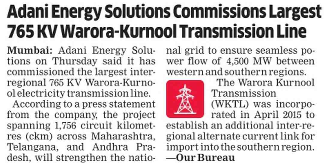 Adani Energy Solutions Commissions Largest 765 KV Warora-Kurnool Transmission LineOct 20, 2023 | The Economic Times