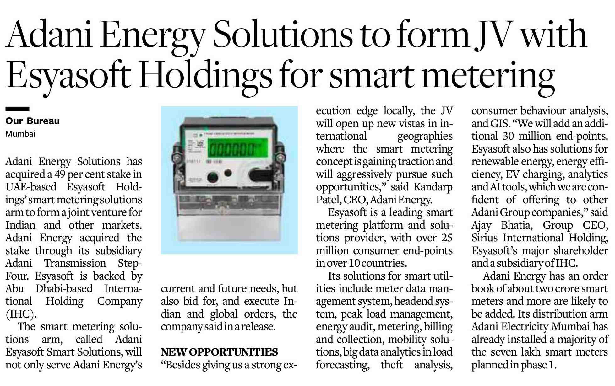 Adani Energy Solutions to form JV with Esyasoft Holdings for smart meteringNov 28, 2023 | The Hindu Business Line